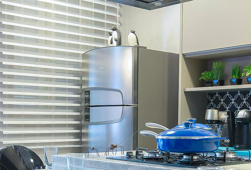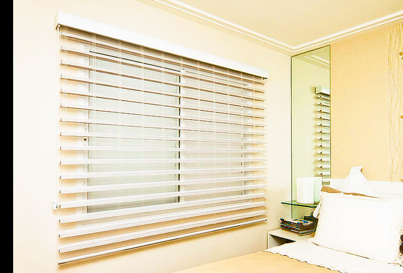 A Cortina Eternity traz leveza ao ambiente, porque as faixas horizontais do tecido mais grosso, parecem ‘flutuar’. A tela fina permite visualizar o lado externo e, com a entrada da luminosidade, torna o ambiente claro e bastante acolhedor.