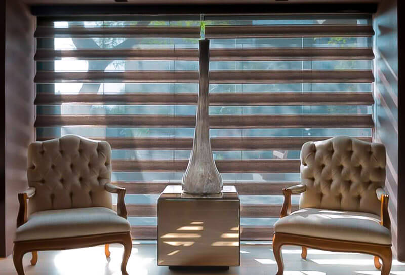 O movimento para cima ou para baixo da tela faz as faixas do tecido mais grosso se moverem, criando ângulos que são responsáveis pela entrada da luminosidade. Incrível, né? Se totalmente estendidas, as faixas horizontais impedem a entrada de luz. Por outro lado, quando posicionadas em ângulos menos fechados, são criadas faixas de luminosidade em todo o ambiente. O efeito é muito bonito e deixa a decoração mais dinâmica e interessante.